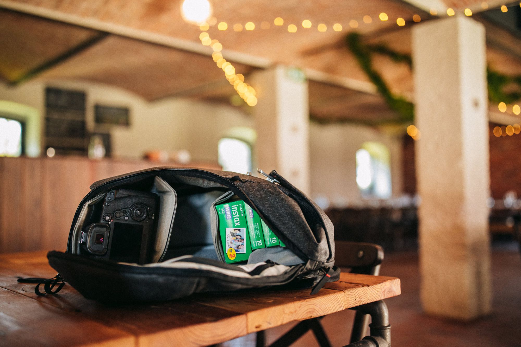 Plecak miałem dotychczas ze sobą na dziesięciu ślubach i pięciu sesjach i tylko raz użyłem drugiej od dołu sprzączki (gdy górną część komory miałem wyładowaną wkładami do Instaxów), to — nie licząc sesji — pełnił on wyłącznie funkcję „transportera korpusów”. Nadal nie wyobrażam sobie pracować z nim podczas reportażu (choć tylko ze względu na fakt, że jestem ubrany na tyle elegancko, że moje Billinghamy pasują mi dużo bardziej). Co więcej — bez względu na kwestię ubioru — ciężko byłoby mi polecić go fotografowi ślubnemu, dla którego miałby to być jedyny plecak, chyba że rzeczywiście miałby mieć go cały czas na plecach. Chodzi bowiem o to, że został on zaprojektowany w taki sposób, że dostęp do jego zawartości jest wygodny, gdy plecak jest założony. W przypadku odstawienia go, żeby dostać się do wnętrza, trzeba położyć go bokiem na podłożu — nie zawsze jest ono czyste czy przyjazne plecakowi. I choć nie martwiłbym się o sam plecak (tj. jego trwałość), to jednak cały ten brud znajdzie się na moich rękach, gdy będę chciał dostać się do wnętrza plecaka z drugiej strony.