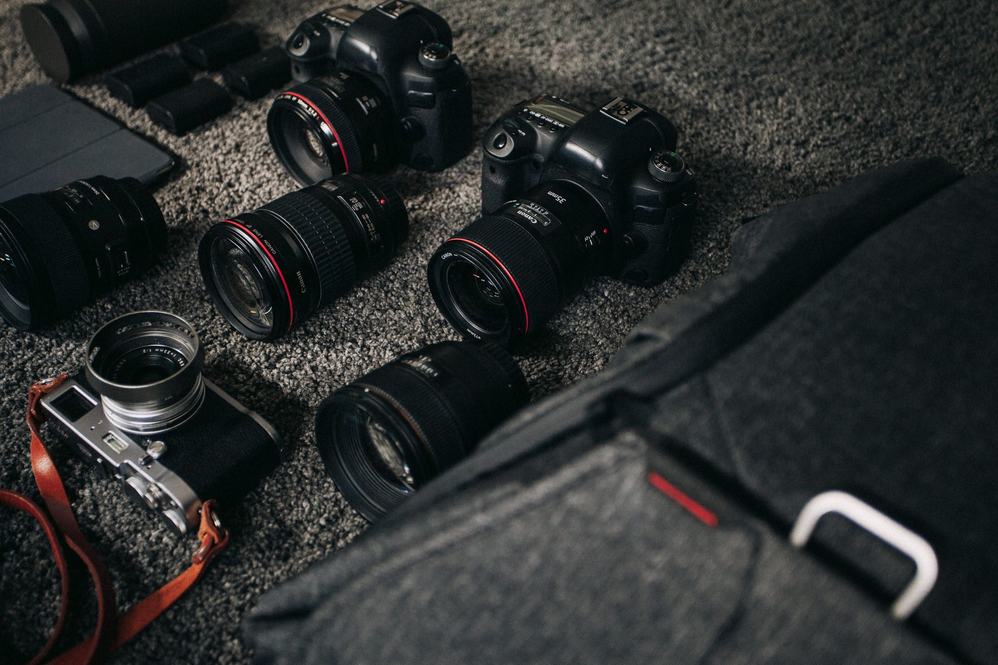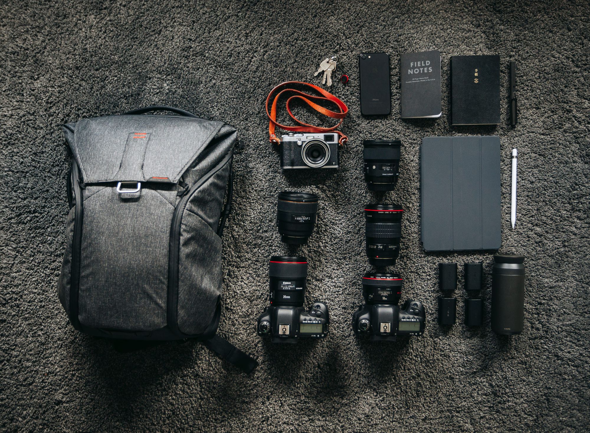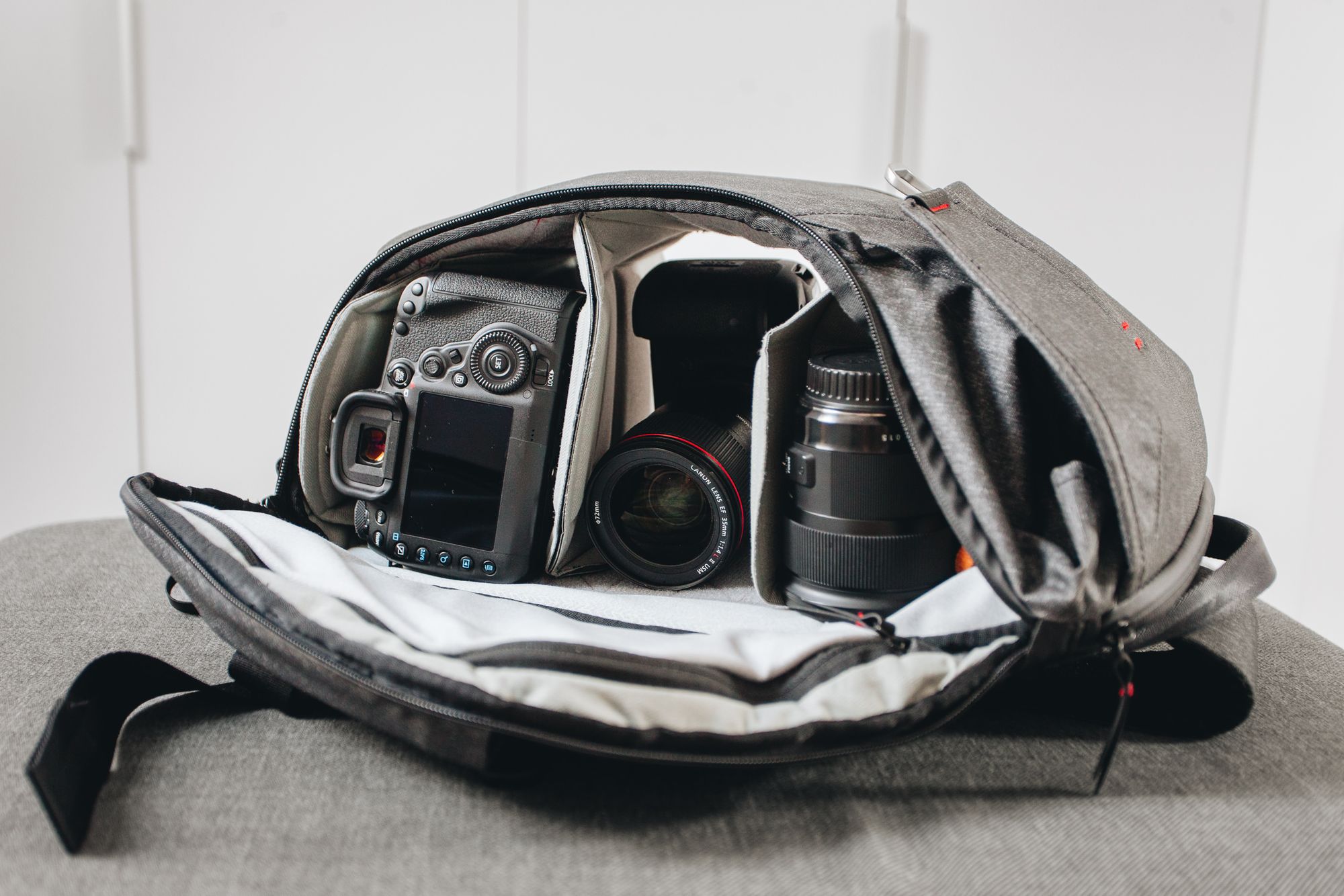 Cóż, na sesje jeżdżę z dwoma aparatami (to ta moja „zdrowa paranoja” — zawsze mam z tyłu głowy lęk, że przecież jeden z tych aparatów może przestać działać, a jeśli nastąpi to np. na szczycie góry, na który wchodziliśmy ostatnie 3 godziny, to co?) więc pierwsza próba zapakowania plecaka miała na celu odpowiedź na pytanie „co poza dwoma Canonami 5D4 uda mi się do niego zmieścić i czy to będzie wystarczająco, żeby na sesje móc nie zabierać niczego więcej?”. Zapakowałem go więc w następujący sposób: