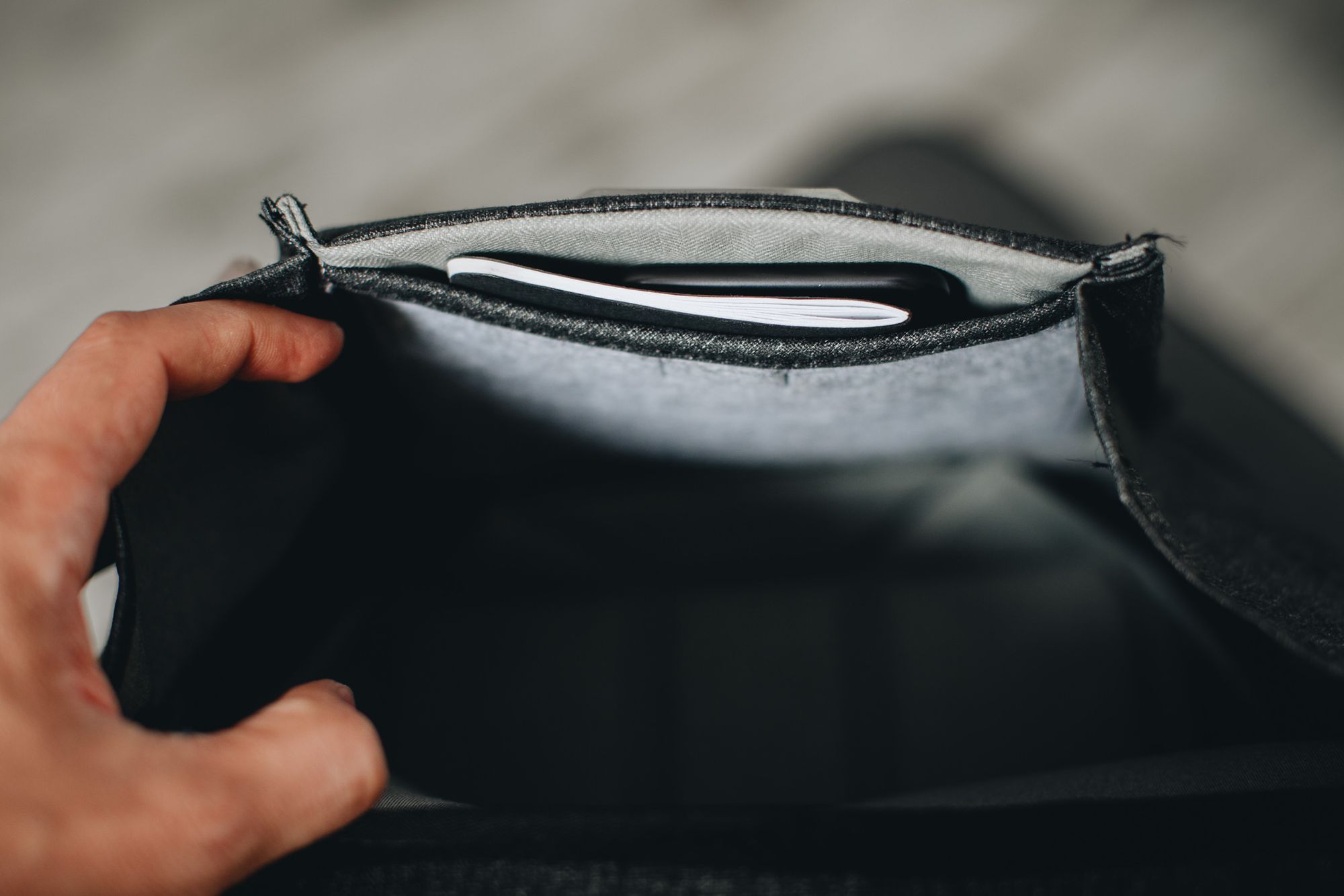 Co zaś tyczy się tej najmniejszej kieszonki wewnątrz — mieszczę w niej portfel, telefon (iPhone 7 ustawiony pionowo blokuje magnes, ale po włożeniu da się go obrócić do pozycji poziomej — aktualizacja: iPhone Xʀ już się tak nie mieści) oraz notes Field Notes — ten ostatni również „na styk”.