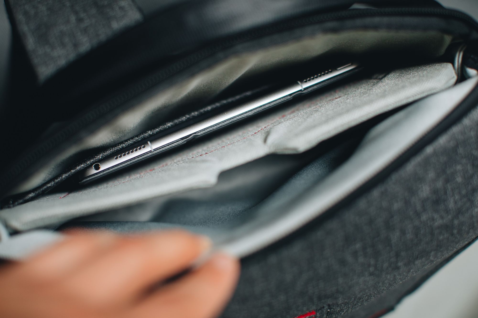 Za główną komorą mieści się jeszcze przestrzeń na laptopa, mieszcząca nawet 15-calowego MacBooka Pro (także starsze modele). W jej wnętrzu znalazła się także przegroda na tablet (10,5-calowy iPad Pro mieści się tam bez problemu) oraz wyściełana miękkim materiałem płytsza przestrzeń np. na okulary.