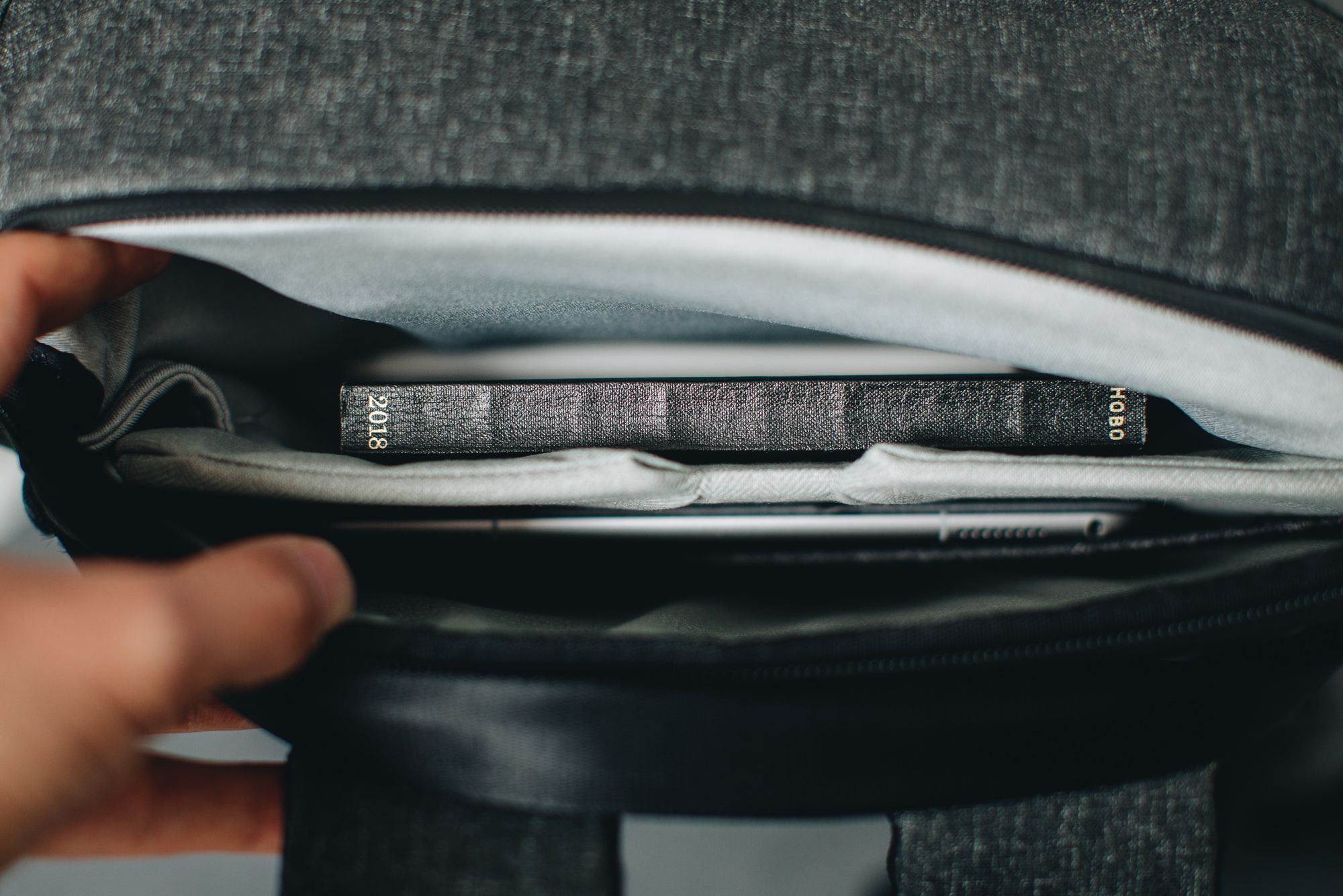We wspomnianej wcześniej, wyściełanej miękkim materiałem, kieszonce mieszczę notes Hobonichi oraz Apple Pencil.