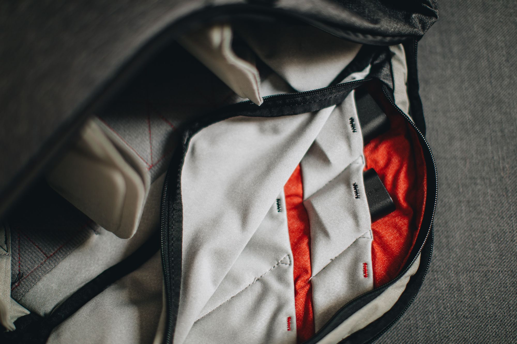 Boczne klapy także zostały wyposażone w kieszonki, kryjące się pod kawałkiem elastycznego materiału, odkrywanego po odpięciu kolejnego wspaniale działającego zamka błyskawicznego. Z jednej strony jest 5, z drugiej 3 kieszonki różnej wielkości — wszystkie wykonane z bardzo rozciągliwej tkaniny, która z dość dużą siłą przytrzymuje włożone do nich przedmioty. W tych częściach plecaka kryje się jeden z moich ulubionych „smaczków” z nim związanych. Otóż wspomniane kieszonki mają na środku przeszycia — czasem czerwone, czasem czarne.