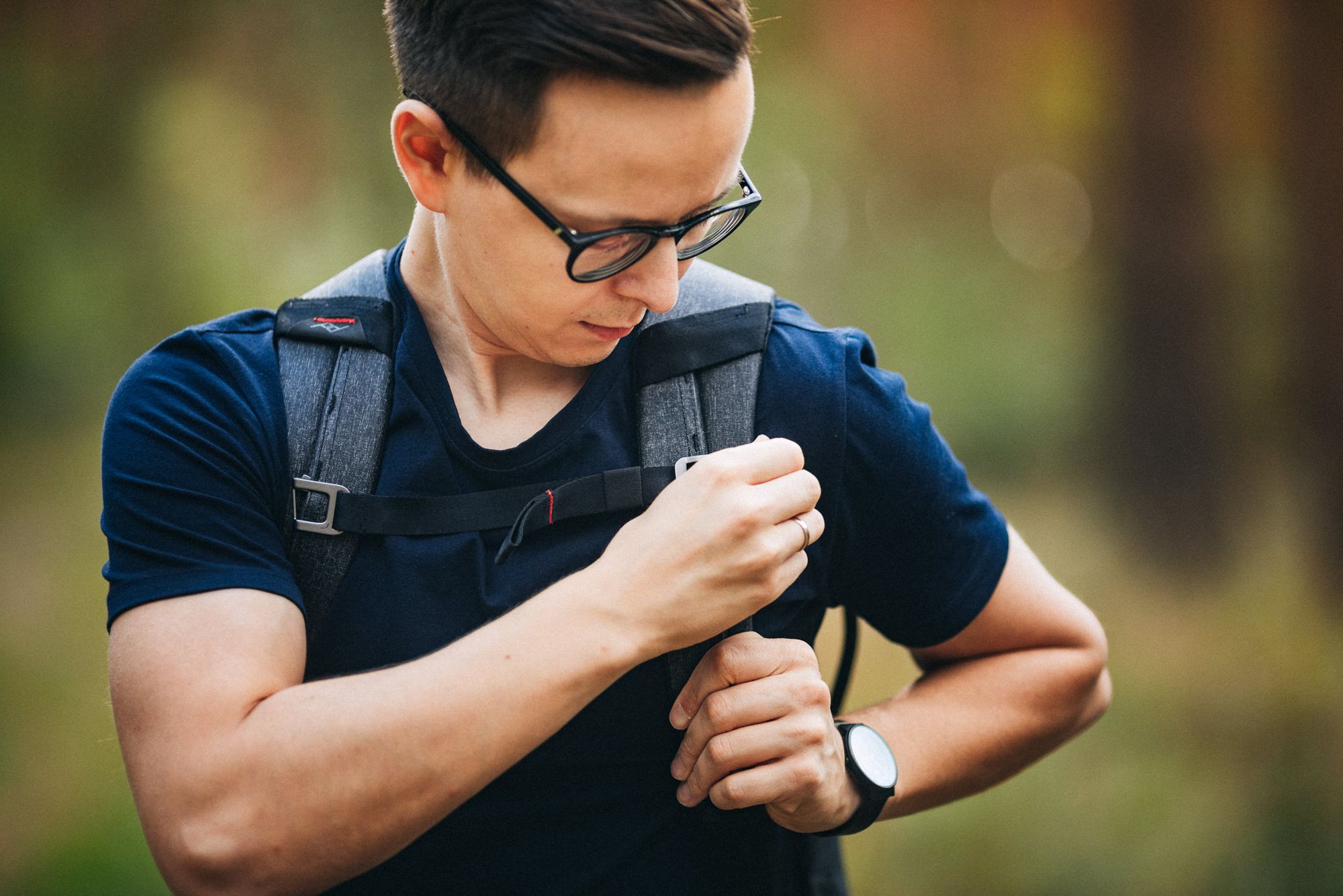 Przydatny jest natomiast pasek łączący szelki na wysokości klatki piersiowej i — jak większość elementów w Peak Design — też jest wyjątkowy. Otóż nie tylko pozwala na regulację długości jedną ręką i nie tylko może być zapięty na jednej z kilku wysokości, to jeszcze można go przypiąć tylko do jednej szelki, gdy nie chce się z niego korzystać, w taki sposób, że w żaden sposób nie wisi i tym samym, nie buja się, idąc (dlatego żałuję bardzo, że zgubiłem go w Tatrach — dla chętnych; powinien być gdzieś na Nosalu).